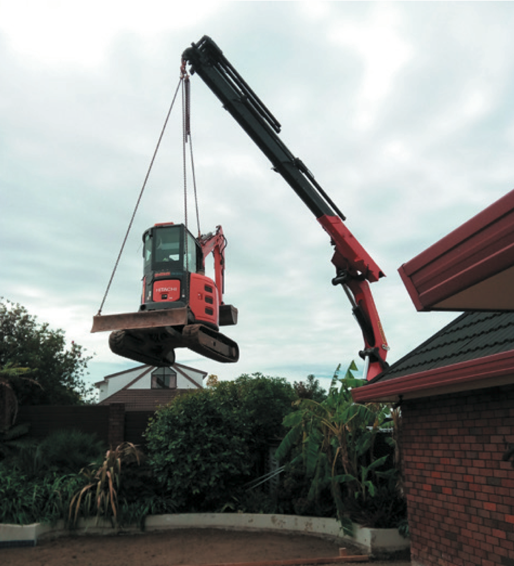 Recently I wondered how we were going to fill in a swimming pool in a hard to reach backyard of a site (I know, who fills in an existing pool?). Turns out, you simply Hiab a digger over the fence and onto the site – no probs!